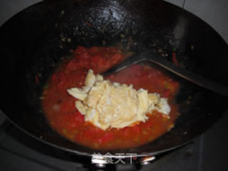 加入西红柿煸炒一会,用铲子把西红柿捣成小块,能看到西红柿有汤汁溢出。