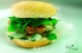 将洋葱,生菜,番茄都过热水焯一焯,捞起放一旁凉一凉且沥水。切两片火腿,备用。然后就是依次码好:面包-火腿片-生菜-洋葱-番茄-沙拉酱(我选的芝麻味的,我的最爱)-肉饼-沙拉酱-番茄-洋葱-生菜-火腿片-面包。完工。早餐吃饱吃营养,一天干活都不累,(*^__^*)