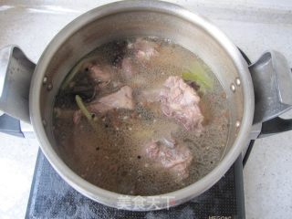 烧开,撇去肉末,加入葱、姜、花椒、大料、草果、干辣椒、香叶和食盐、料酒、生抽,扣上锅盖,压15分钟。