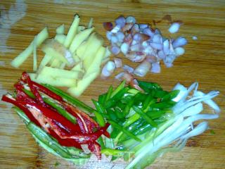 姜.青红椒切丝.干葱头切碎.葱分开葱白与葱绿.将葱白切成细丝..葱绿斜刀切短.