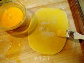 另擀面团儿成薄片,切成三角形或方形均可。把肉馅放在三角型面皮宽的一端。