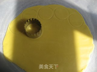 将面团擀成厚约0.3厘米的面片,用直径5厘米的切模切出一个个圆形面片