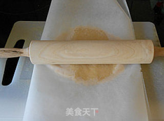 将面团放在烘焙纸上,擀成薄饼状。然后把整块薄饼和烘焙纸移到烤盘中,边上有多余的面,就把它填补在空档中。