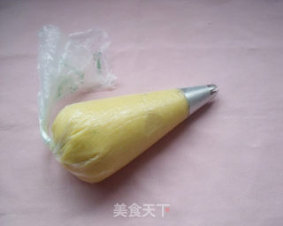 先将花嘴放入裱花袋中,再装入饼干面团。