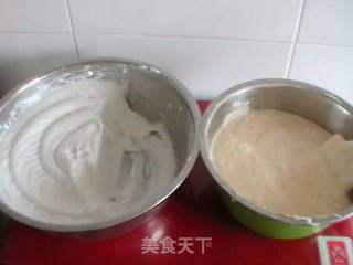 蛋黄糊和剩下的三分之二蛋白拌匀,倒入模具,震出大气泡。放入烤箱倒数第二层,160度30分钟,再转150度70分钟。