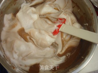 再将剩下的三分之二的蛋白霜加入到面糊中,用橡皮刮刀轻轻从低下往上翻拌均匀