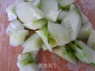 黄瓜洗净去皮切成滚刀块,大小与鹌鹑蛋相仿