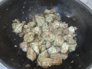 下入切好的石蛋,煸炒到石蛋表面焦黄,加入蒜茸辣酱,再加入孜然粒和 孜然粉 及辣椒粉