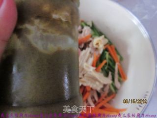 煮好的鸡肉去皮去骨用手丝碎,腐竹泡发,黄瓜、胡萝卜切丝,蒜拍碎。