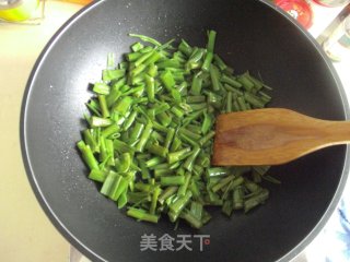 空心菜梗颜色变深后加入切碎的辣椒、蒜末一起翻炒。