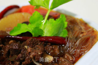 连肉带汤转移到砂煲中,炖煮至肉烂;等羊肉炖烂后,再转移到汤锅中,加入萝卜块继续煮;等萝卜块煮熟了,最后加入粉丝,1-2分钟即可。
