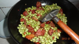 倒入待用的青毛豆,翻炒一会