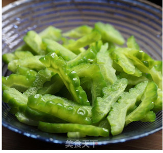 2、烫好的苦瓜捞出后要放入冷水冷却,保持清脆爽口.