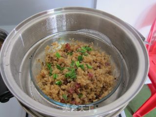 把配料放进糯米饭中用筷子搅拌均匀,继续把糯米蒸至熟透。