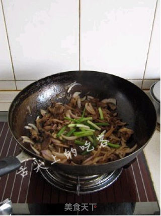 再次加热锅中剩余的油,到4成热时放入洋葱炒出香味,然后放入之前炒好的羊肉片,淋入酱油、孜然粒、盐、白糖拌匀后炒出香味,最后在出锅前撒上孜然粉、香葱段拌匀即可。