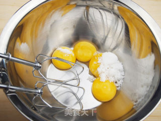 将1克盐放入蛋黄盆(图3)。盐可以让糖的甜味不那么腻。再加入10克细砂糖。用电动打蛋器搅打均匀。