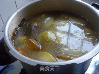 息气开盖倒入海带跟节瓜,大火烧开转小火煲20分钟