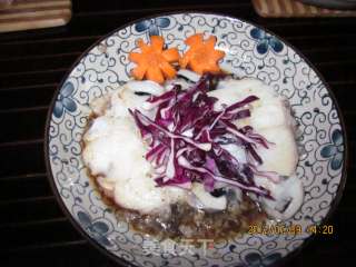 胡萝卜切成花状摆到盘子上,紫甘蓝切丝放到鱼上面。装饰一下。