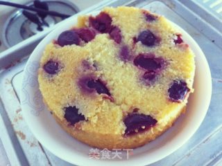 正面,没有及时盖上锡纸的后果,因为蛋糕膨胀就将樱桃遮盖住了,如果用方形的模具(15厘米烤模)则会没那么厚