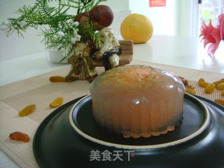 将装有大菜丝液体和黄心薯的小碗(摊凉以后)放入雪柜冻一小时之后将凝固的“水晶月饼”轻轻的从小碗里倒出来。