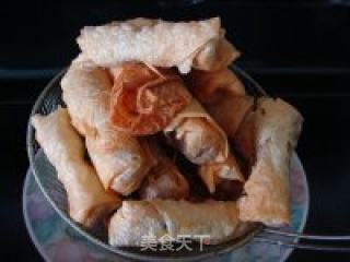 可以用煎的方法将包好的腐皮卷煎到酥皮,也可以用少许油将腐皮卷快速炸一下马上捞起。(因为腐皮很容易就炸酥脆,所以炸的时候放下油锅马上捞起即可)