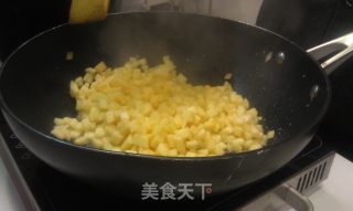 冷锅放入40g黄油, 二苹果粒进行翻炒至软,加入适量的糖及玉桂粉