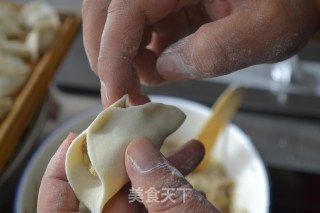 下面是老爸的演示,第一种食堂快速包法,大家自己看应该能看懂先放馅儿,用手兜着,左手虎口捏着,右手配合两手一挤就好了,慢慢体会。我也练了半天