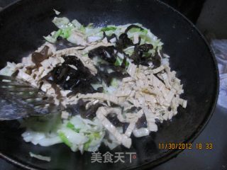 肉丝下油锅炒变色,盛出,卷心菜炒软,加杏鲍菇,香菇,黑木耳,腐竹翻炒