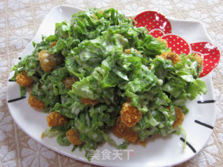 9 生菜切细丝,倒入调好的沙拉酱料,把炸好的牛肉条放在生菜丝里,用筷子卷好即可。