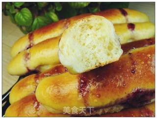 非常省事的长排包,不用造型,用酸甜的蓝莓果酱做点缀,吃一条,还想再吃一条。