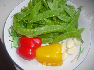 荷兰豆洗净,去两头的梗,顺带剥下老筋,放入水中焯烫;蒜切成末;彩椒切成菱形块。