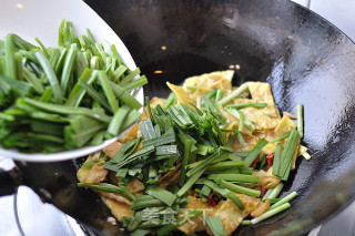 3、韭菜茎与韭菜叶分开入锅、放入韭菜叶后要快速翻炒,防止韭菜叶软烂。