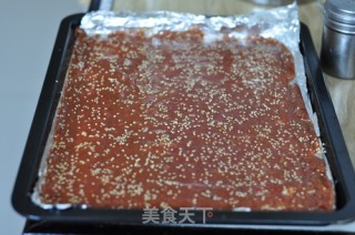 拿出来倒扣在烤网上,刷一层蜂蜜水,撒芝麻,继续烤20分钟。