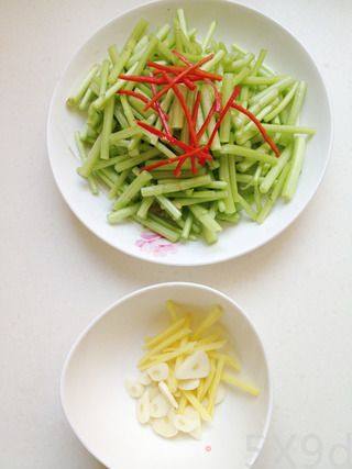 茼蒿留杆,切段,大蒜切片,姜切丝备用,可少准备些装饰的红椒丝