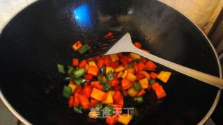 另起锅放少许橄榄油,放入一块咖喱融化后依次放入彩椒丁儿,临出锅前放入胡萝卜丁,放少许耗油生抽出锅即可。