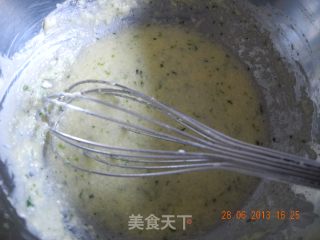 在拌匀的面粉糊中加入海苔碎,轻轻搅拌