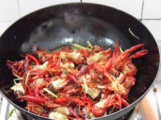 放入整理干净的小龙虾,大火翻炒,调入生抽2勺子,老抽一勺子,料酒一大勺,五香粉继续翻炒使之均匀