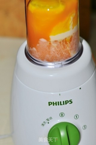 芒果汁倒入粉碎机里面,加入1小匙蜂蜜。