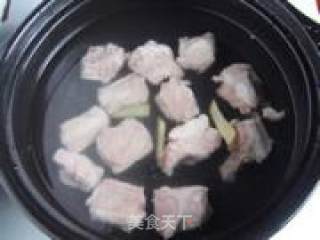 锅中加水,放入姜片和葱白,水开以后放入洗净的排骨绰去血水。