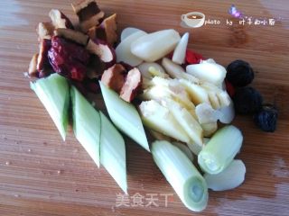 大葱切成小段,生姜和大蒜瓣切成片,桂圆去壳,大枣去核切成小块