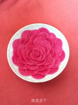 将腌好的萝卜一片一片的排放在盘上像一朵花一样,大功告成。