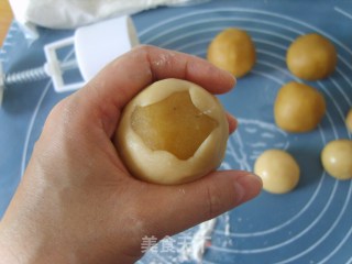在模具里撒点干粉,让干粉均匀粘在模具壁上,然后轻轻磕两下把多余的干粉磕出来,然后把包好的月饼团光滑的一面冲里放进月饼模里。再用手把面团压实,底部要压平。