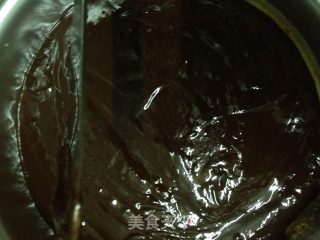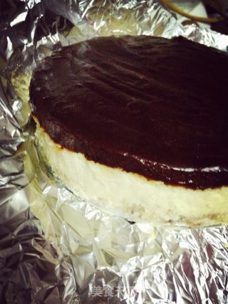 巧克力混合液冷却后倒入烤好的未脱模蛋糕上,放冰箱冷藏4小时
