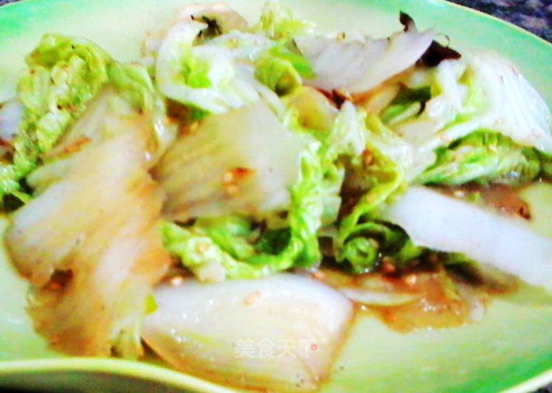 大约1-2分钟后,放入白菜叶,翻炒至菜熟,先后放入盐、白芝麻和鸡精,拌匀装盘即可