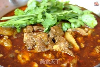 待羊肉酥烂,捞出葱姜及大料不要,盛入酒精锅中即可。