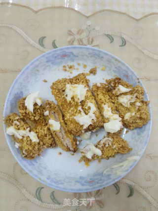 1猪肉用切成片,然后用肉锤拍大到原来的1.5--2倍大小,放入料酒、味极鲜、黑胡椒粉和盐、糖适量腌制半小时。2然后第一层裹面粉,第二次裹蛋液,第三层裹面包糠。放到六成熟的油锅里炸一下就好啦。3Duang!出国后吸掉油分,然后切一下装盘,放上喜欢的沙拉酱就好啦